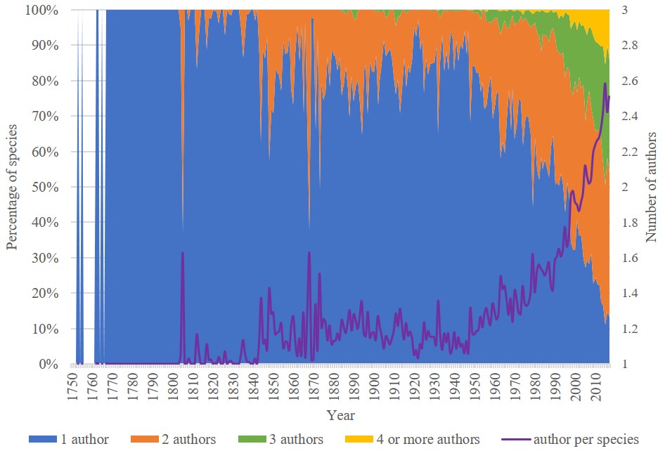 研究中进一步探讨了菌物分类学的研究模式。研究类群方面,早期的分类学者多数是跨多个类群开展广泛研究,而现在的分类学者更趋向于在各个特色类群进行深入研究。在研究团队方面,早期分类学者更喜欢“单打独斗”、独自完成新物种的描述和发表,而近几十年来,分类学者们更喜欢团队合作的研究模式,多数物种被2人及以上的分类学团队发表。在研究质量方面,每年新发表名称被接受的比例逐步上升,而异名、不合格或不合法名称等所占的比例正在逐年下降,这反映出新物种发表的质量在逐渐提高。