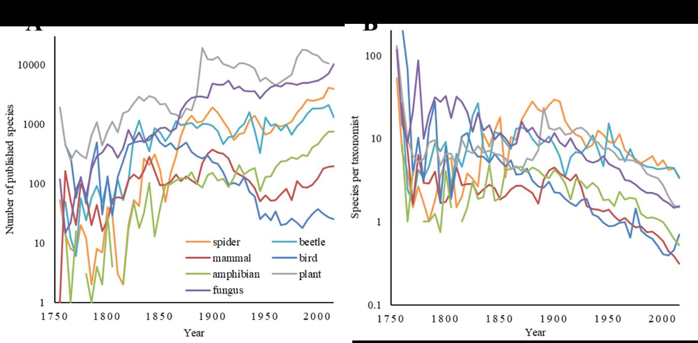 统计各个类群描述物种数量随时间的变化趋势发现,哺乳动物和鸟类分别在1920年和1850年前后描述速度增速放缓,其余类群增长趋势较为相似。21世纪以来,菌物新物种发表的数量呈现指数型增长,而其他类群则处于缓慢增长、持平甚至下降状态(见图1A)。而在分类学者研究效率方面,各个类群的分类学者平均描述新物种的数量随时间而减少(图1B)。